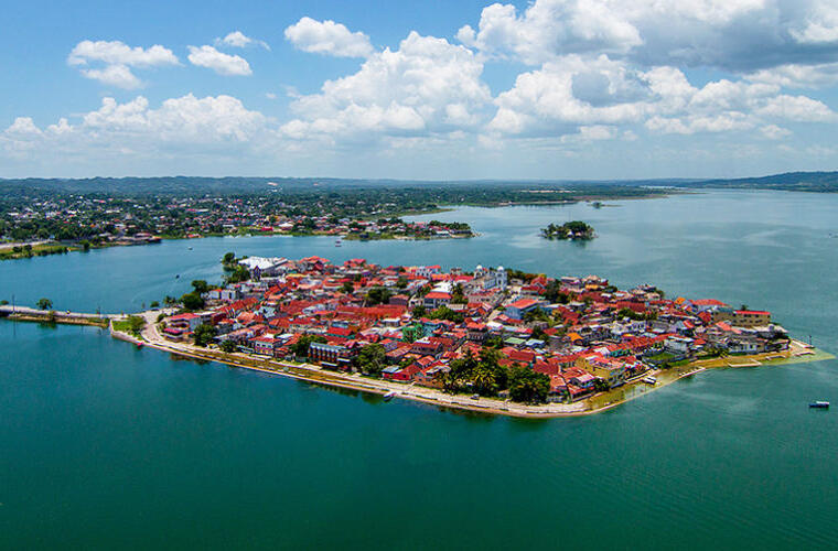 Flores Island in Guatemala is located in Peten, one hour south of Tikal. It is surrounded by the third biggest lake in Guatemala, Lake Peten Itza.